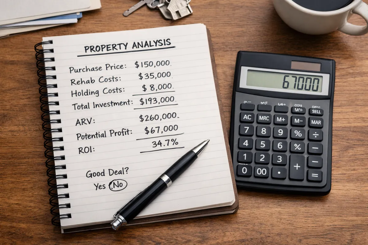 A fix and flip calculator helps real estate investors estimate the profitability of renovating and reselling a property. It analyzes purchase price, renovation costs, holding expenses, financing costs, and resale value to project potential profit and risk before buying the property.